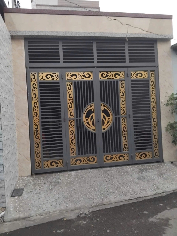 Các hoa văn cuốn lượn mạ vàng đồng bố trí dọc theo cánh và viền khung, kết hợp cùng nền sơn tĩnh điện màu xám đậm tạo nên vẻ đẹp cổ điển nhưng không lỗi thời. Hệ thống nan thoáng phía trên và hai bên giúp lưu thông không khí mà vẫn đảm bảo độ kín đáo và an toàn cho ngôi nhà.
