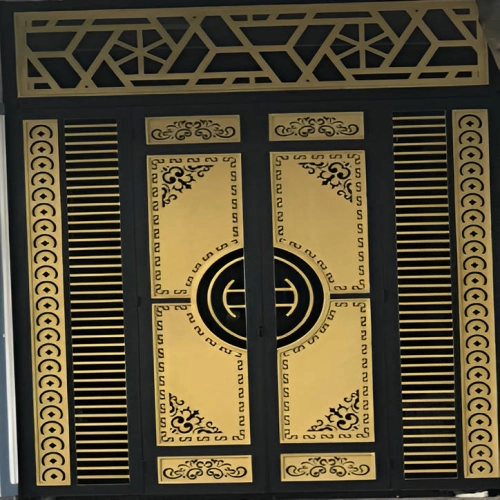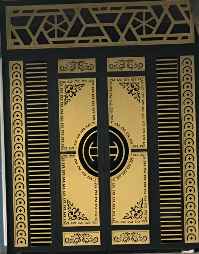 Toàn bộ cổng được sơn đen mờ phối vàng kim, tạo hiệu ứng thị giác nổi bật mà vẫn giữ được nét sang trọng, quý phái. Cổng sử dụng chất liệu thép tấm dày, sơn tĩnh điện 2 lớp giúp chống oxy hóa và duy trì độ bền màu lâu dài ngay cả trong điều kiện thời tiết khắc nghiệt.