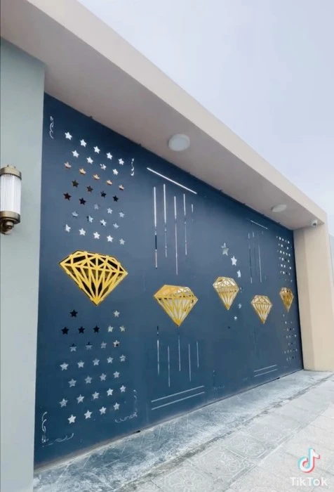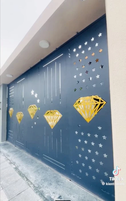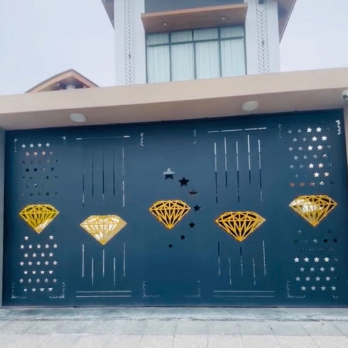 Mẫu cổng sắt CNC KD168 là lựa chọn táo bạo và đầy cá tính cho gia chủ yêu thích phong cách hiện đại, độc đáo. Thiết kế gồm 5 viên kim cương màu vàng ánh kim nổi bật, được cắt CNC tỉ mỉ, tạo hiệu ứng thị giác mạnh mẽ giữa nền sơn đen mờ huyền bí.