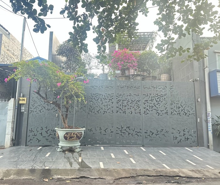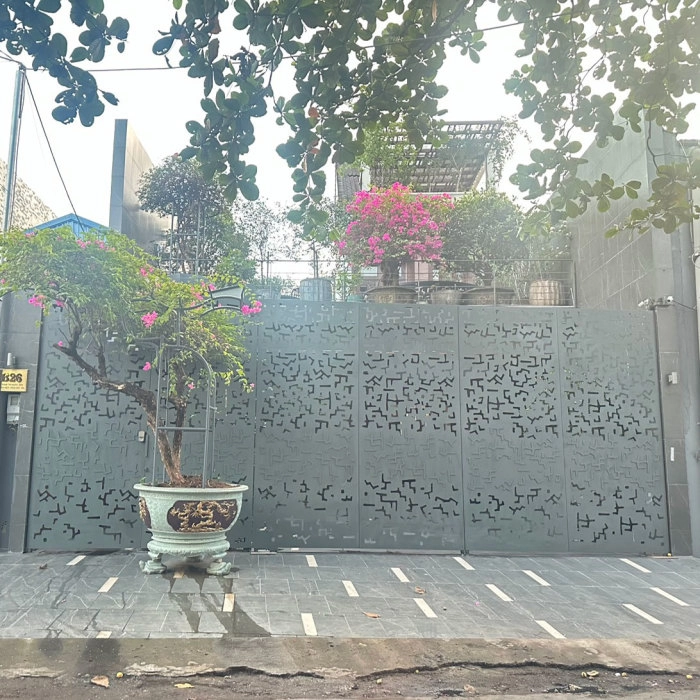Toàn bộ cổng được cắt laser CNC trên thép tấm liền khối, phủ sơn tĩnh điện màu xám tro trầm, phù hợp với nhà phố hiện đại, biệt thự tối giản hoặc công trình kiến trúc đương đại.