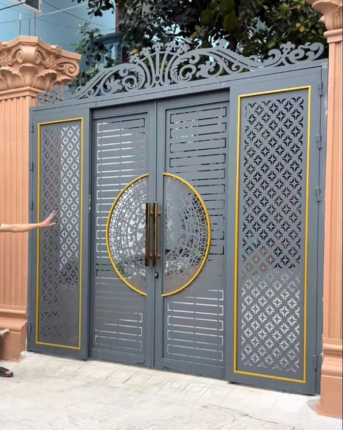 Cổng được thi công từ thép hộp sơn tĩnh điện màu xám lông chuột, phối vàng kim và chi tiết vòm CNC trên đỉnh giúp tăng chiều cao, phù hợp với các căn nhà phố cao tầng hoặc biệt thự mini có cột trang trí lớn.