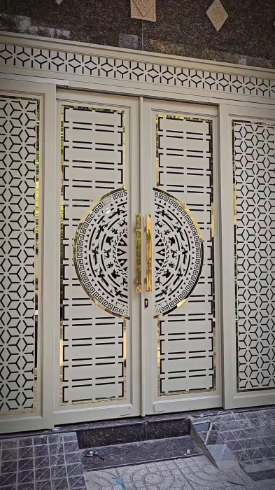 Hai bên cánh phụ và hàng chớp trên sử dụng hoa văn hình học lặp CNC, có độ thoáng hợp lý nhưng vẫn kín đáo. Phần nan ngang ở hai cánh chính giúp tổng thể cổng trở nên mạnh mẽ và cân đối.