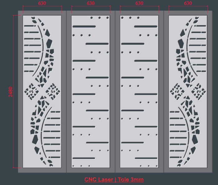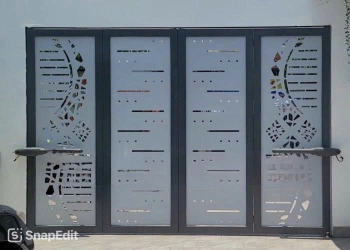 Điểm nhấn của cổng nằm ở hai dải hoa văn CNC cách điệu bên cánh phụ, được cắt laser theo đường cong nhẹ và chấm tròn nghệ thuật. Kiểu dáng đơn giản nhưng tinh tế, tạo nên vẻ đẹp hiện đại không rườm rà, phù hợp xu hướng nhà phố mới.