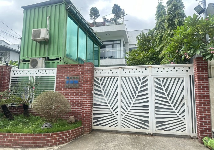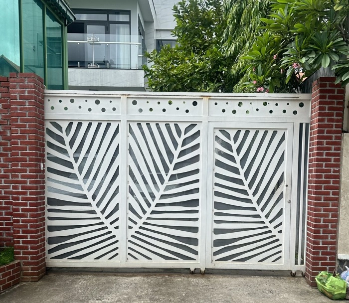 Toàn bộ khung sắt được sơn tĩnh điện màu trắng ngà, nổi bật trên nền tường gạch đỏ truyền thống, tạo nên sự đối lập đầy ấn tượng về mặt thẩm mỹ. Phần trên cổng được trang trí thêm các lỗ tròn tạo độ thoáng, góp phần làm mềm không gian mà vẫn giữ được độ riêng tư.