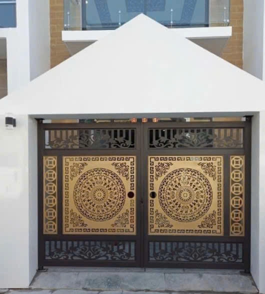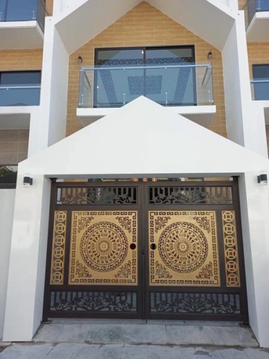 Đây là mẫu cổng thép hộp kết hợp thép tấm CNC trang trí, sử dụng công nghệ cắt laser hiện đại trên nền thép tấm 5mm, cho ra hoa văn sắc nét, bền bỉ. Họa tiết trống đồng được bao quanh bởi các đường viền hình học cổ điển và các hoa văn uốn mềm ở góc, tất cả đều được mạ vàng đồng ánh kim tạo độ sang trọng và nổi bật khi nhìn từ xa.