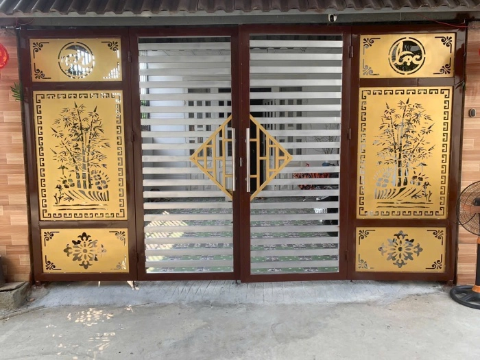 Mẫu cổng được thiết kế với sự kết hợp tinh tế giữa thép tấm cắt CNC họa tiết trúc – thư pháp, và nan inox sọc ngang giúp lấy sáng, tạo độ thoáng cho không gian bên trong. Hai bên là các tấm thép hoa văn được cắt bằng công nghệ CNC chính xác, thể hiện hình ảnh bamboo (trúc) – biểu tượng cho sự kiên cường, may mắn và trường thọ trong văn hóa Á Đông.