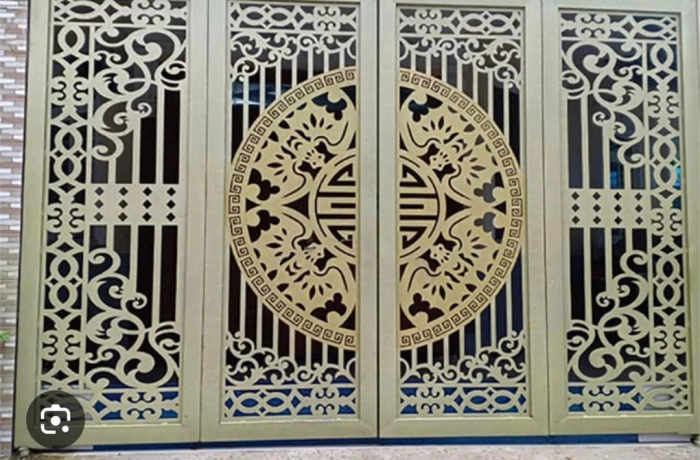Mẫu cổng thép CNC hoa văn nổi bật với thiết kế đối xứng gồm 4 cánh, sử dụng thép tấm cắt bằng công nghệ laser CNC hiện đại. Trung tâm cổng là họa tiết tròn lớn mang biểu tượng chữ Thọ cách điệu, bao quanh bởi các hoa văn hình học cổ điển như hồi văn và liên hoa, thể hiện sự trường tồn và thịnh vượng.