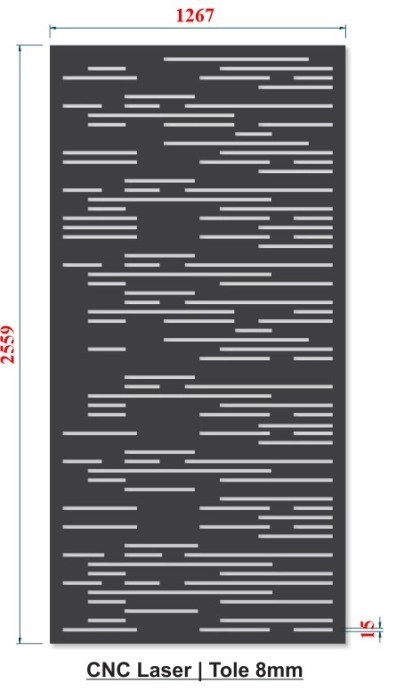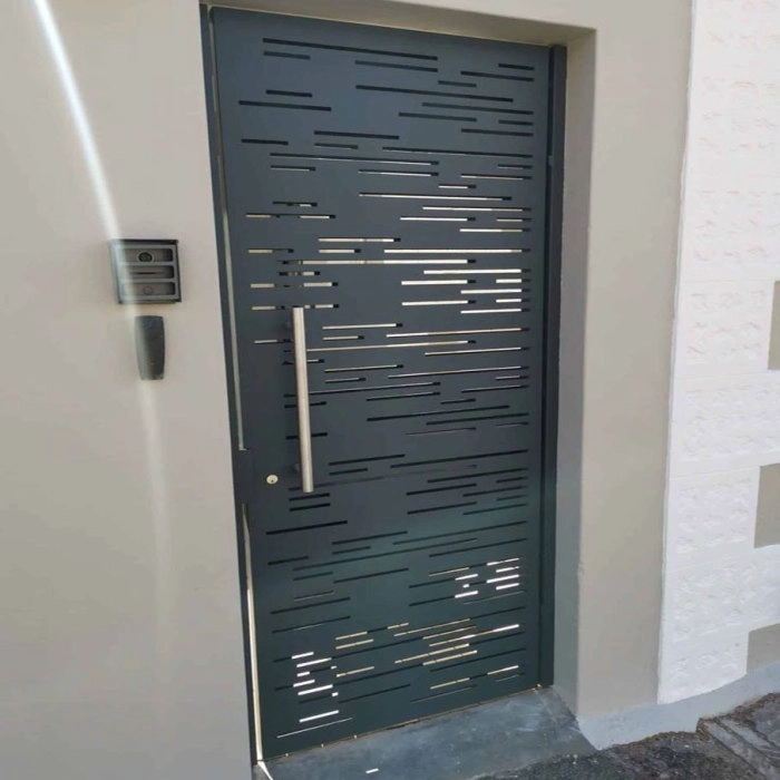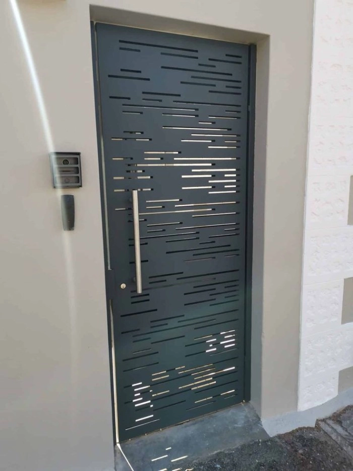 Cửa nhỏ cho lối đi sau nhà hoặc lối thoát hiểm. Cửa CNC laser thép tấm được tạo hình đơn giản bởi sọc ngang ngẫu nhiên kín đáo và hiện đại.