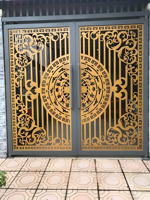 Cổng sắt CNC KD276 – họa tiết trống đồng và hoa văn mới thanh lịch