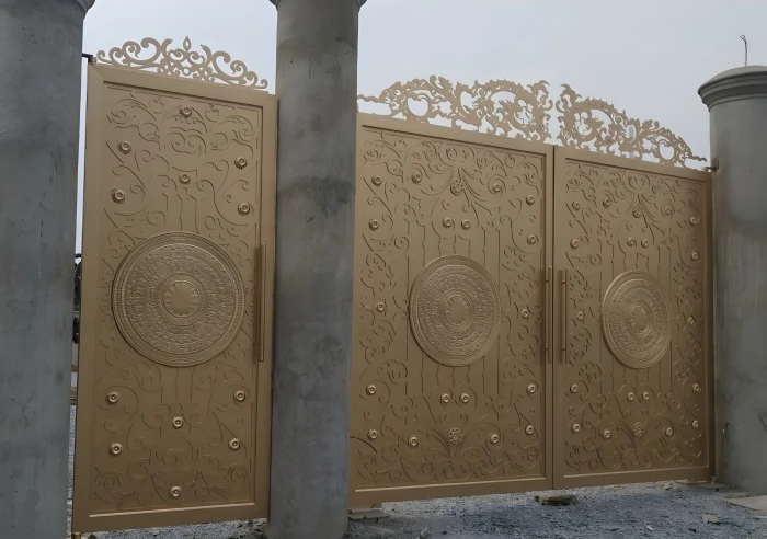 Cổng sắt CNC KD276 – họa tiết trống đồng và hoa văn mới thanh lịch