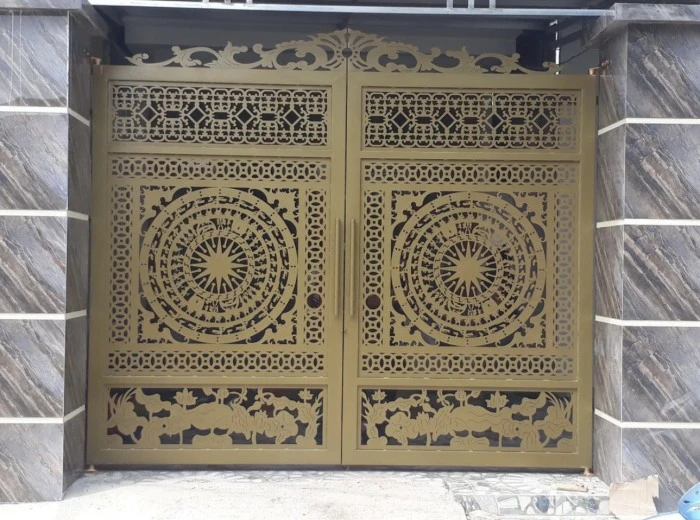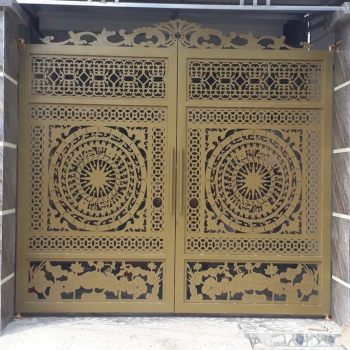 Cổng sắt CNC KD276 – họa tiết trống đồng và hoa văn mới thanh lịch