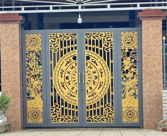 Cổng sắt CNC KD276 – họa tiết trống đồng và hoa văn mới thanh lịch