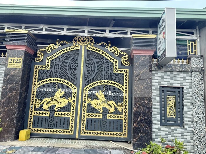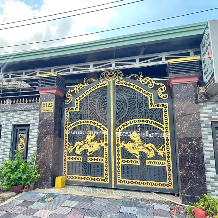Mẫu cổng thép CNC 6mm theo phong cách cổ điển, kết hợp với 2 con Rồng ngước lên cao. Cổng được sơn với các chi tiết vàng - xám làm nổi bật Rồng vàng trên nên hoa văn xám và các đường chỉ vàng làm tác biệt rõ nét các hoa văn CNC trên cổng. Với chi phí hợp lý cửa CNC thép hiện được rất nhiều khách hàng tin tưởng sử dụng