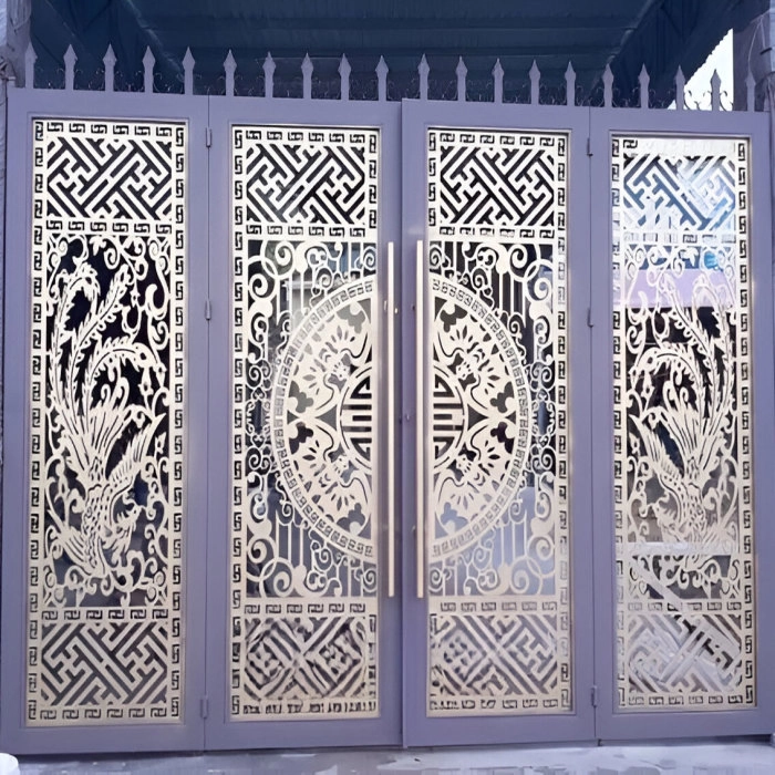 Cổng sắt CNC KD276 – họa tiết trống đồng và hoa văn mới thanh lịch