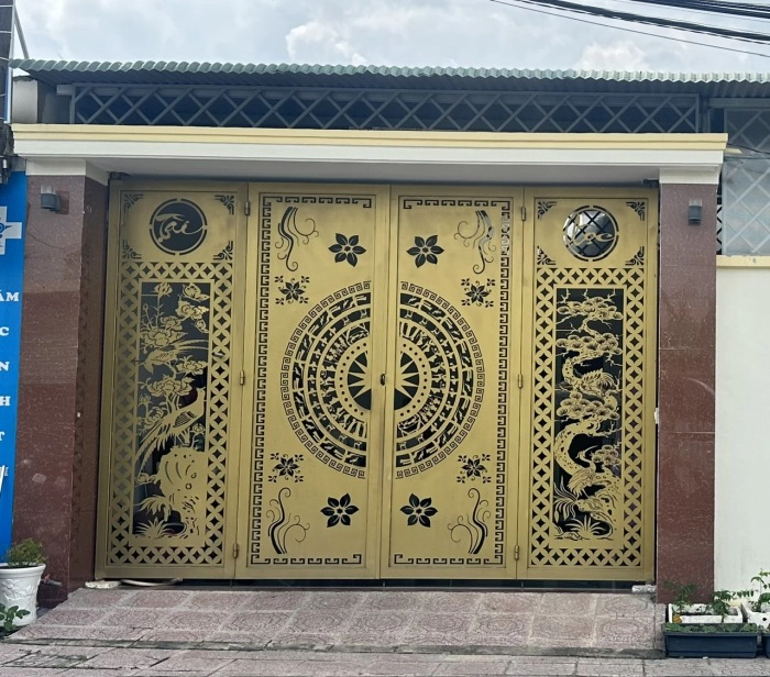 Cổng sắt CNC KD276 – họa tiết trống đồng và hoa văn mới thanh lịch