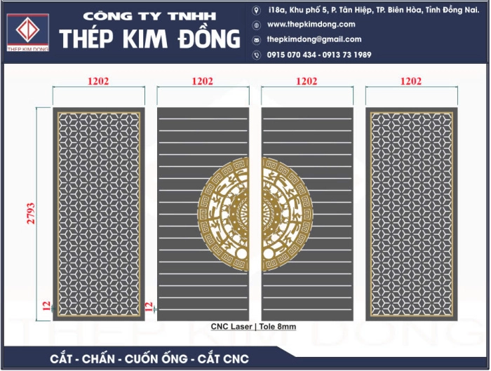 Cổng sắt CNC KD276 – họa tiết trống đồng và hoa văn mới thanh lịch
