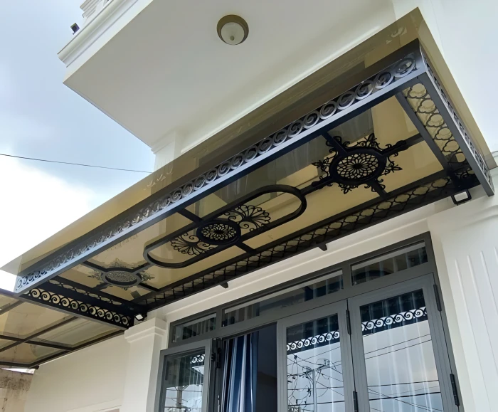 Mái che thép kết hợp CNC thép và kính cường lực 2 lớp.